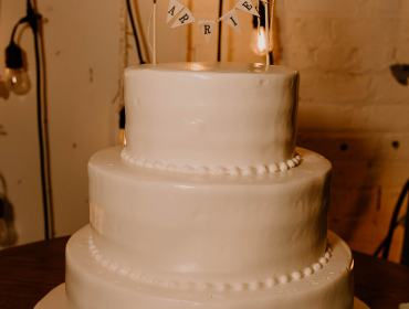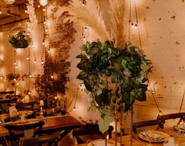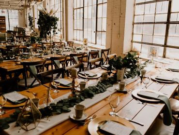 Contrasting the industrial theme of the venue, Moe and Adrianne choose to bring the outdoors inside. With numerous white floral arrangements and pops of color throughout the venue, they incorporated various elements that tie into a rustic theme. The long farm-style tables featured a green leafy runner that spanned the length of the table. In addition, the centerpiece worked to tie in the industrial with a tall metal base and the floral with a green leaf topper. In addition to the centerpieces, the ceilings of the rooms all featured unique elements such as string lights and white floral arrangements (ceremony room) or more greenery and larger globe lights (reception room). All in all, the décor was a great addition to the space, using it to contrast the industrial nature of the venue.